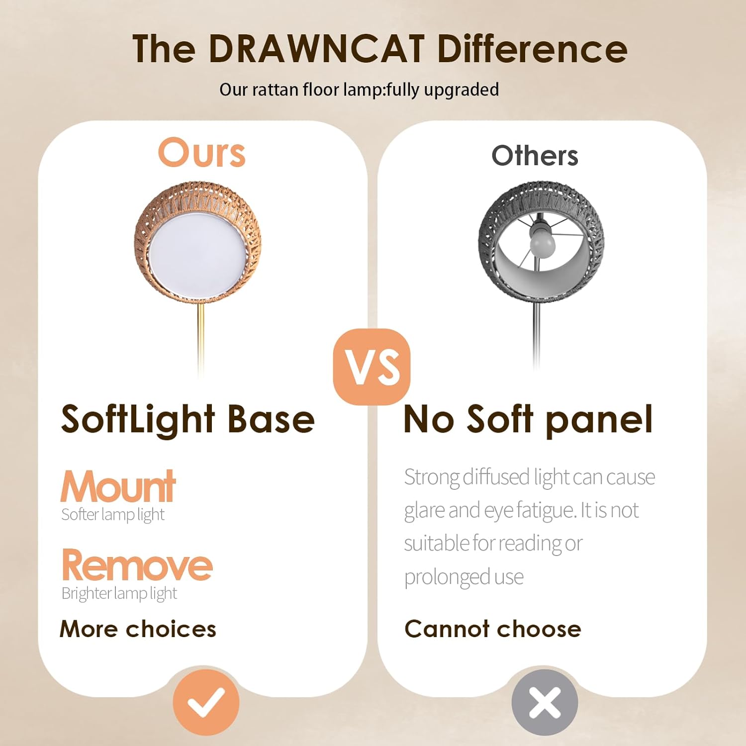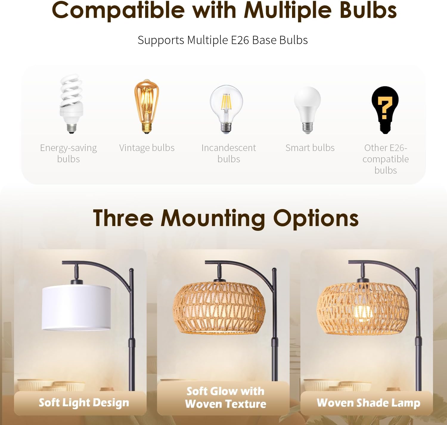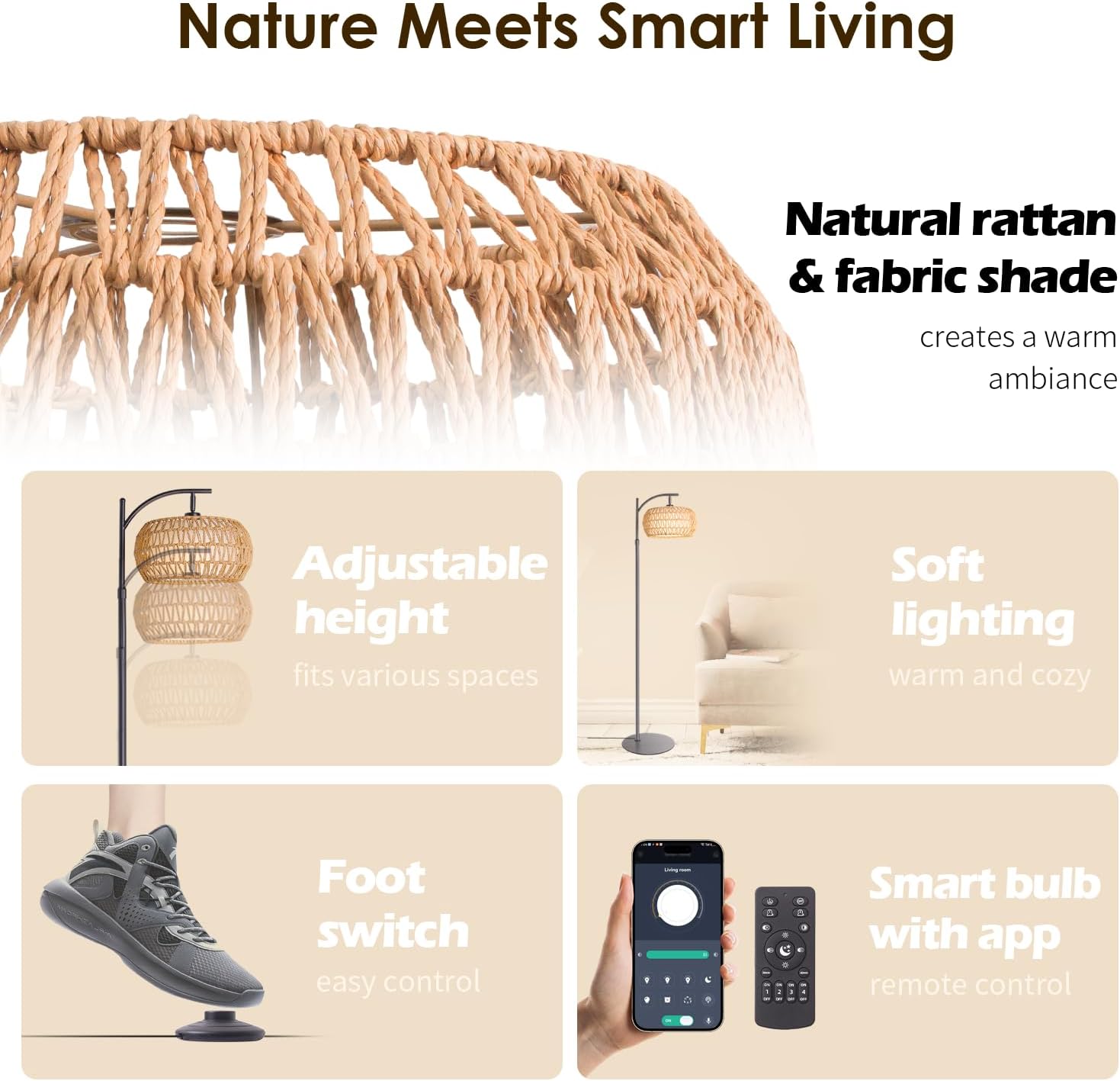 Boho Rattan Floor Lamp with Shade - 12W Bright LED Bulb, Adjustable Height 48-60 Inch, Remote Control 3 Color Temperatures,Farmhouse Handwoven Arc Standing Light for Living Room Bedroom