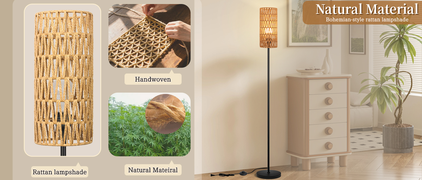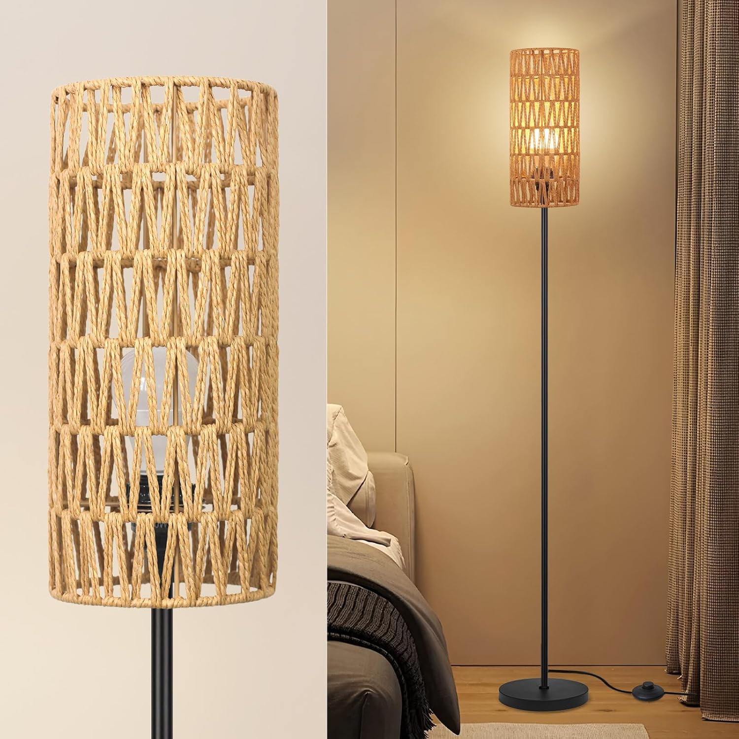 Floor Lamp for Living Room,Farmhouse Rattan Floor lamp,Modern Standing lamp with 3 Color LED Bulb,Black Tall Lamp with Foot Switch